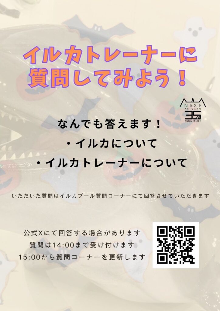 イルカのハロウィンイベントPart1として、10月1日より「イルカトレーナーに質問してみよう!」を実施いたします! イルカの飼育員に聞いてみたいことを専用の用紙に記入し、イルカプール入り口に設置されている質問箱に投函してください。 1日4枚限定で回答させていただきます。また、選ばれた4枚の回答用紙は公式Xにも投稿させていただきます。 たくさんのお客様からのご質問をお待ちしております🐬 期間:2025年10月1日(水)~10月31日(金) 場所:イルカプール入り口に専用用紙、質問箱設置 時間:9:00~14:00まで質問受付、15:00よりイルカプール質問コーナーを更新