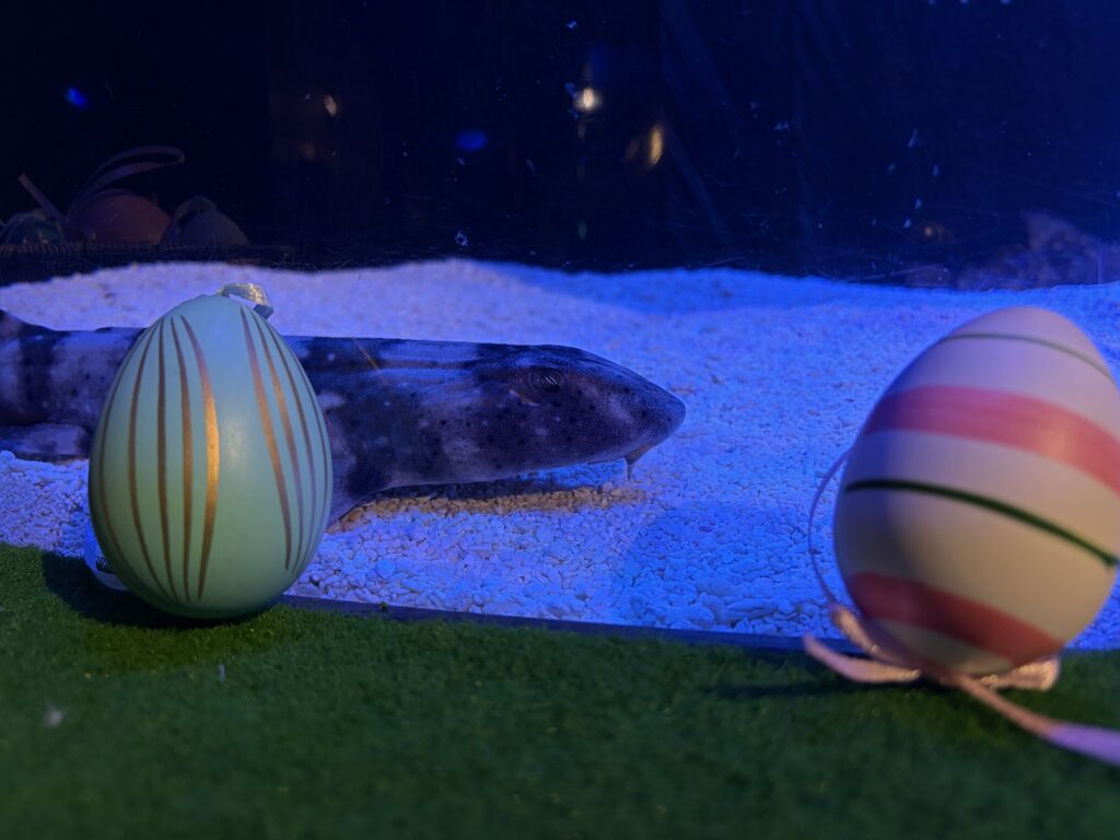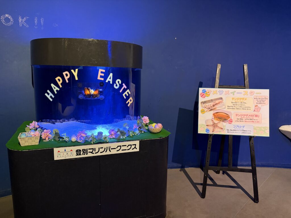 登別マリンパークニクスで繁殖したテンジクザメとその卵殻、水槽周りにはイースターをイメージした装飾を行い、お客様にイースターの雰囲気を楽しんでもらいながら、展示しているサメの繁殖形態についても学べる展示にしました。